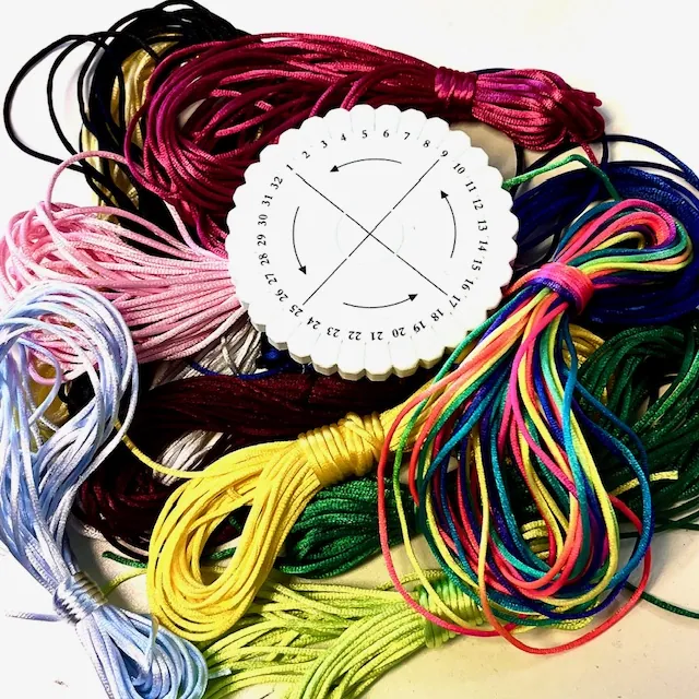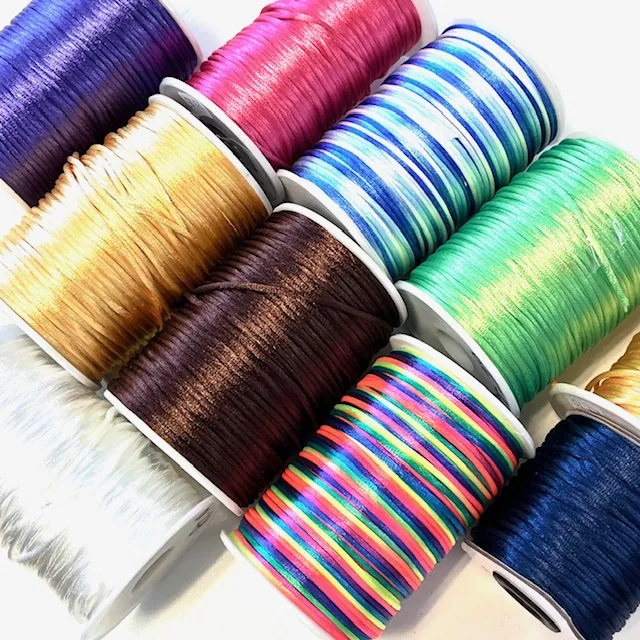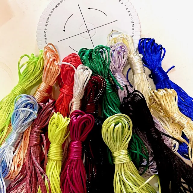 Innehåller minst 100 meter satintråd/Rattail 2 mm. i olika färger, längder 4,3-10 m. 1 st knytskiva på 10 cm. medföljer. Fotot är ett exempel på hur det kan se ut, alla påsar är olika.