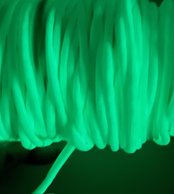 Paracord polyester/nylon. Brottstyrka 550 lbs. 7 innertrådar. Tjocklek 3,2-4 mm. Denna tråd laddas av ljuset och får en självlysande effekt på 3-6 timmar. Ser jätteläcker ut i mörkret.